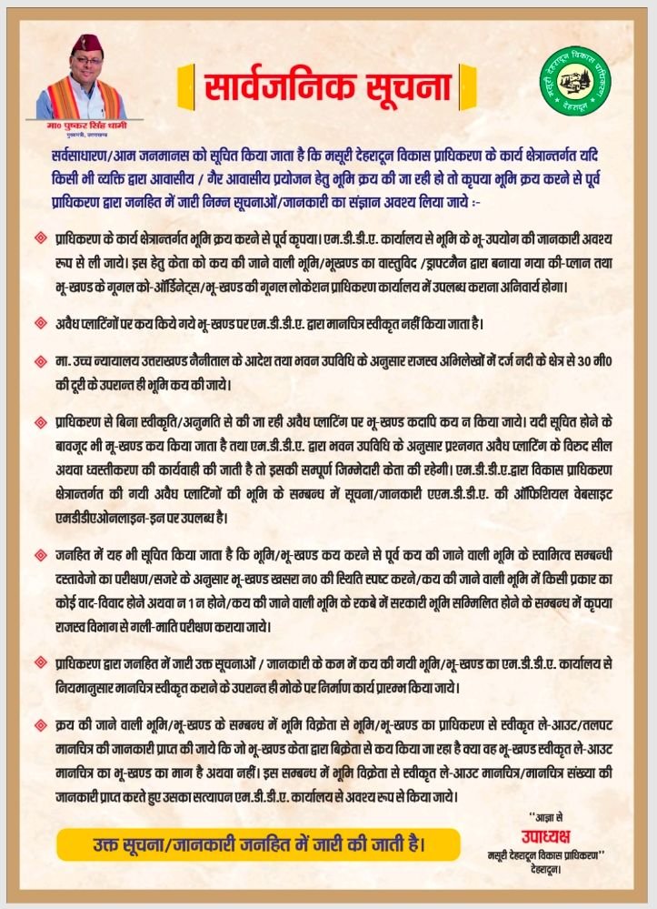 देहरादून: मसूरी–देहरादून विकास प्राधिकरण (एमडीडीए) द्वारा प्राधिकरण क्षेत्रान्तर्गत किए जा रहे अवैध निर्माणों के विरुद्ध सख़्त रुख अपनाते हुए सीलिंग एवं ध्वस्तीकरण की कार्यवाही लगातार जारी है। प्राधिकरण की ओर…